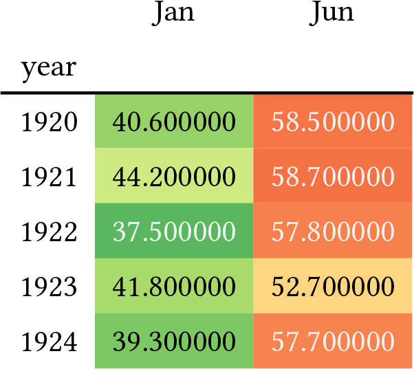 For example, here is a temperature heatmap using gt in R, and pandas in Python.