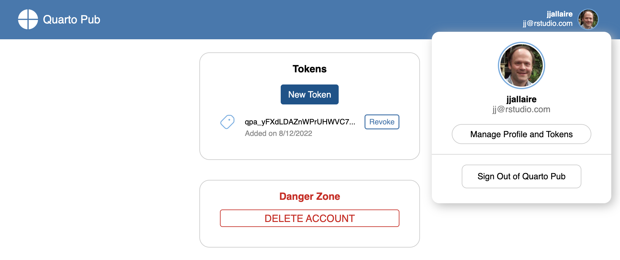 wish to remain available.You can also view (and revoke) access tokens from the admin interface at https://quartopub.com:
